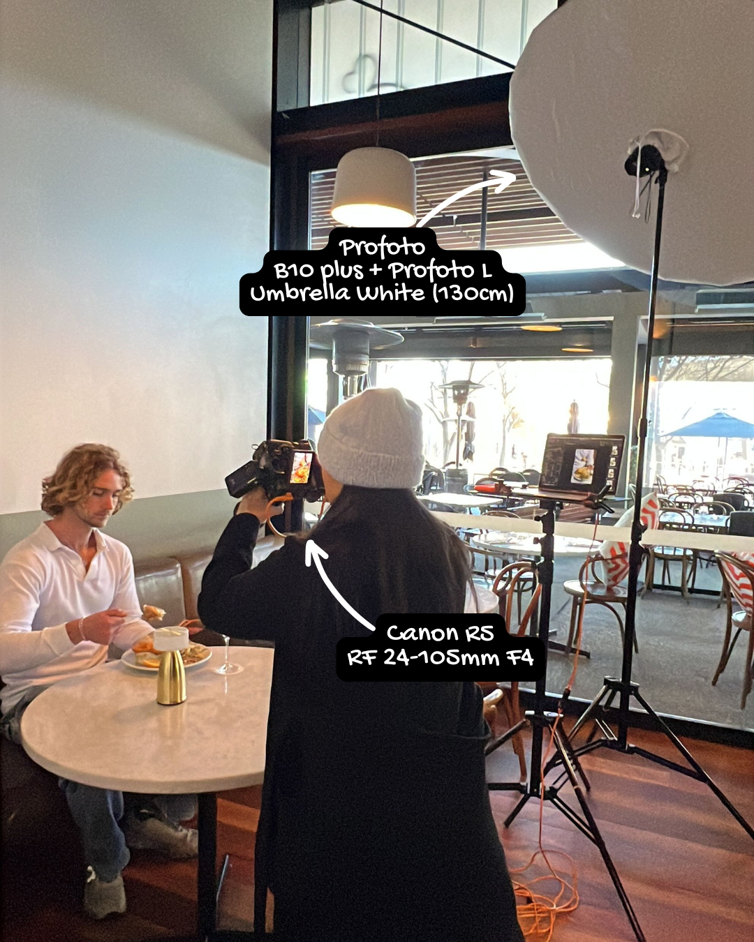 Why this setup? The Profoto B10 Plus is a powerful, compact studio light. When paired with a large, white umbrella (130cm!), it creates an incredibly soft, expansive light source. This is crucial for mimicking beautiful, flattering natural window light. The large modifier was positioned near the window and directed toward the food to gently wrap the light around the dishes, eliminating harsh shadows and bringing out the texture of the lobster pie crust and the glistening fish skin.