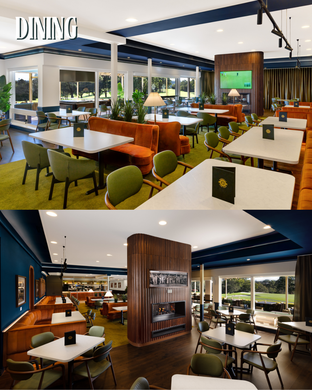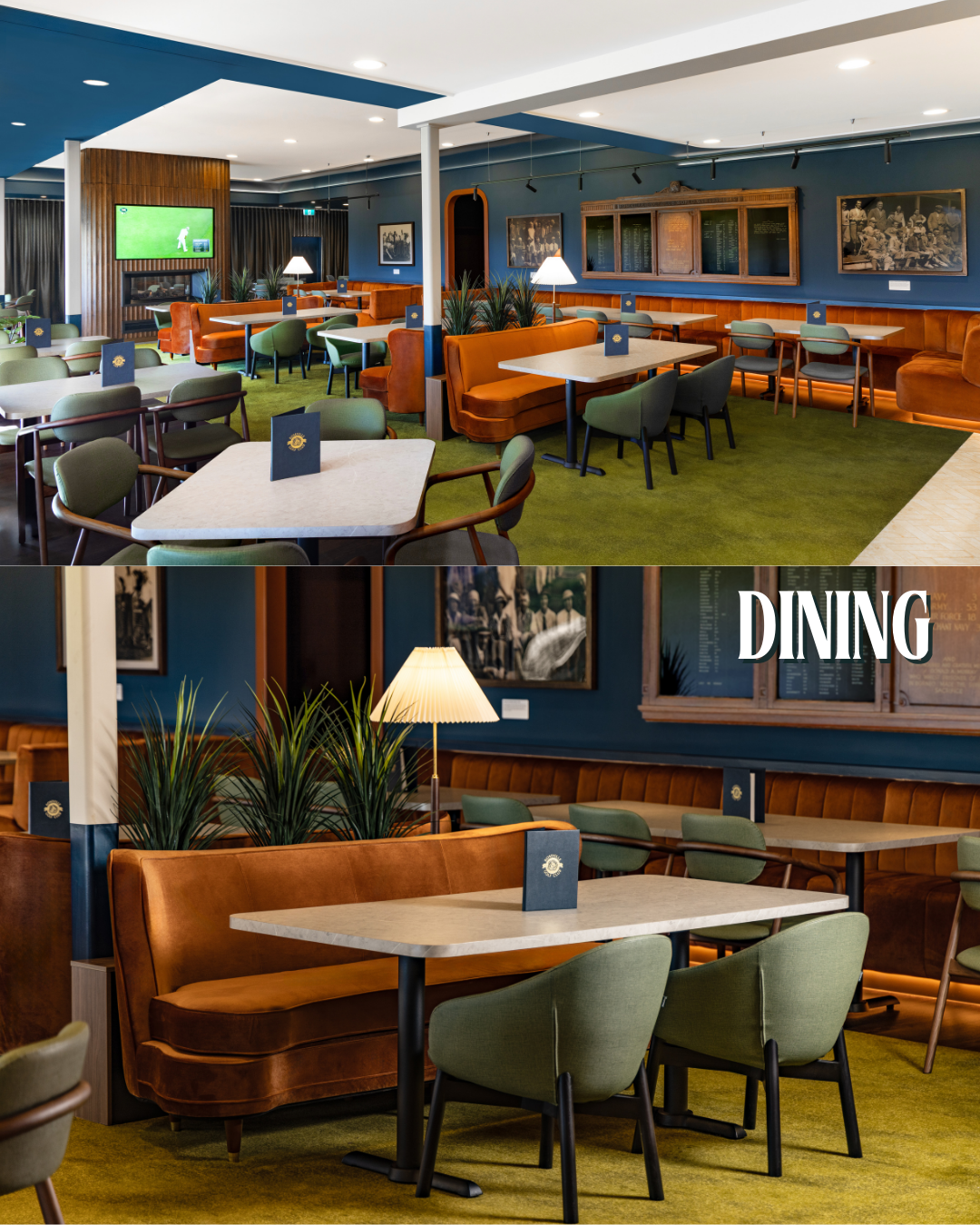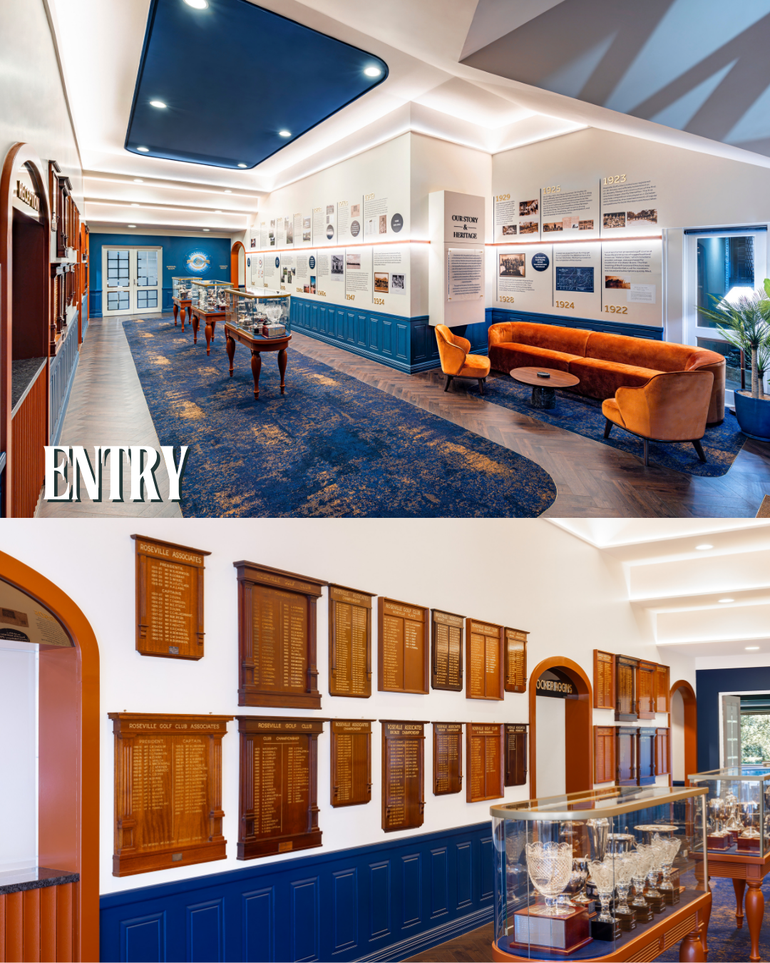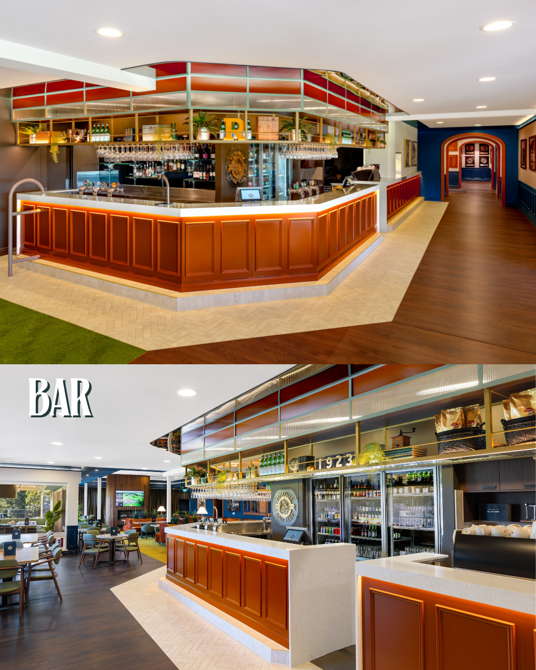 This connection to the past is most explicit in the Entrance area, where original honour boards, plaques, and a detailed heritage timeline are proudly displayed against the vibrant, signature blue wall paneling. The design cleverly uses its Colour Palette: the deep blues, rich terracotta, and olive greens to evoke a sense of timeless sporting tradition, moving beyond a simple facelift to create a space that feels like a modern classic. From the warm timber tones of the Bar that nod to classic clubhouses, to the intentional framing of the course views from the Dining room, the club has achieved a respectful synthesis: a modern destination that truly celebrates the foundations laid by its associates decades ago.