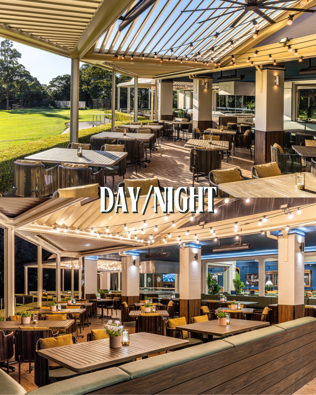 The Day/Night photography reveals how the space effortlessly transforms with the setting sun; the retractable awnings and carefully placed string lights turn the patio into a romantic, illuminated haven. Inside, the modern design extends to versatile gathering spaces.