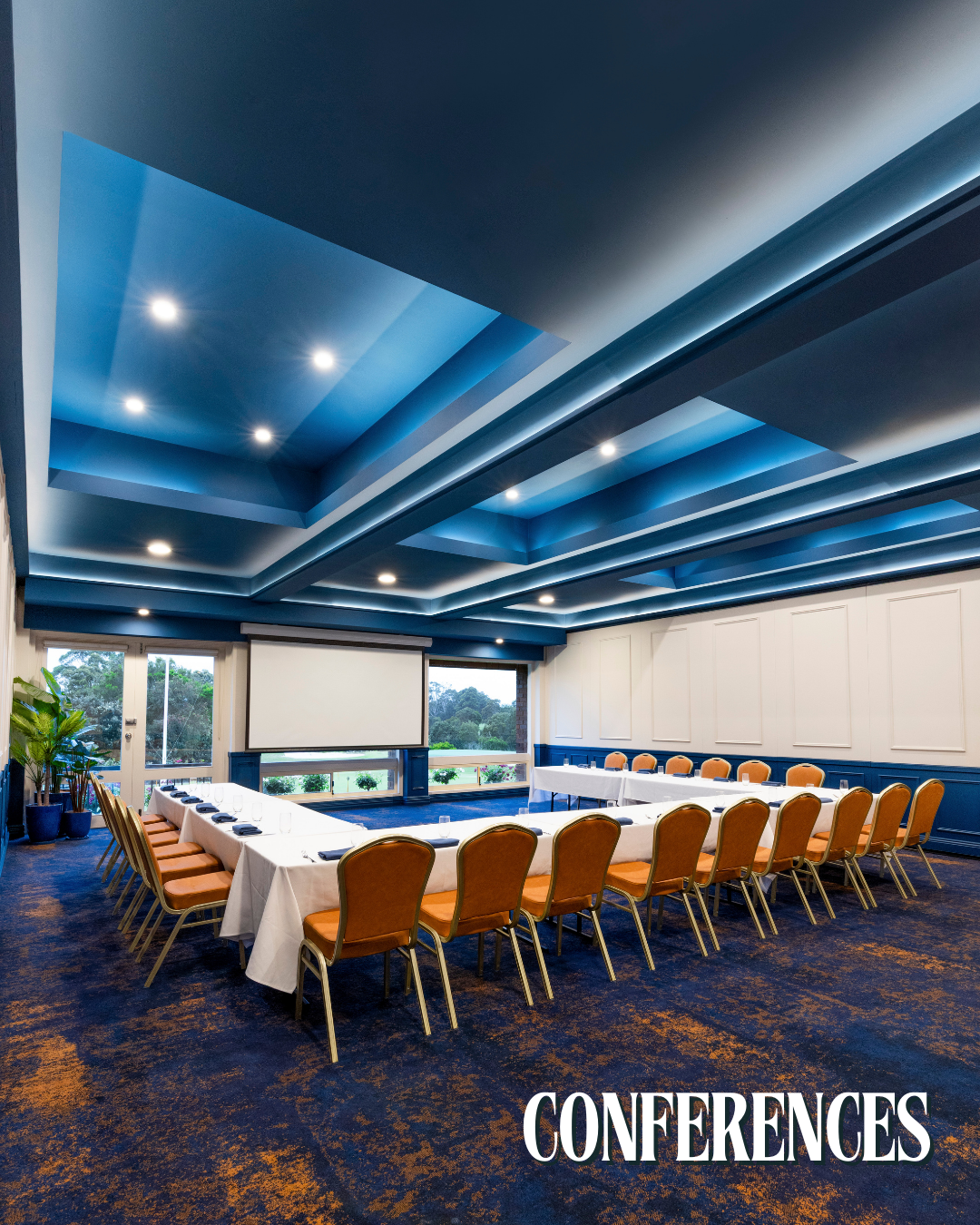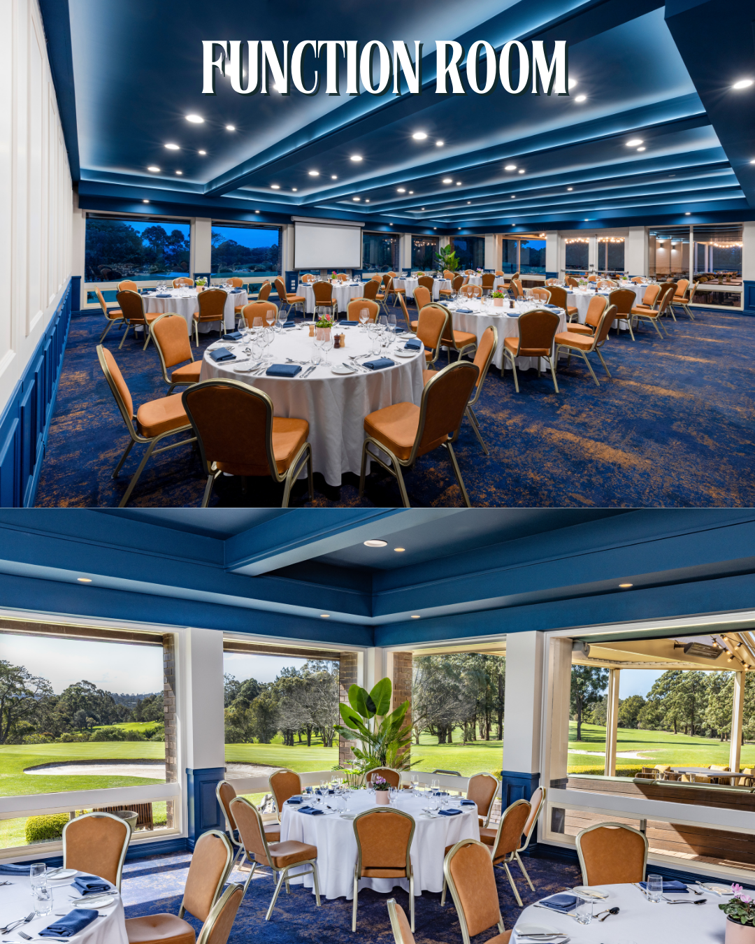 The elegant Bar area serves as a lively hub, while the dedicated Function Rooms and specialised Conference setup offer sophisticated options for large events, meetings, or private celebrations, all framed by panoramic views of the green.