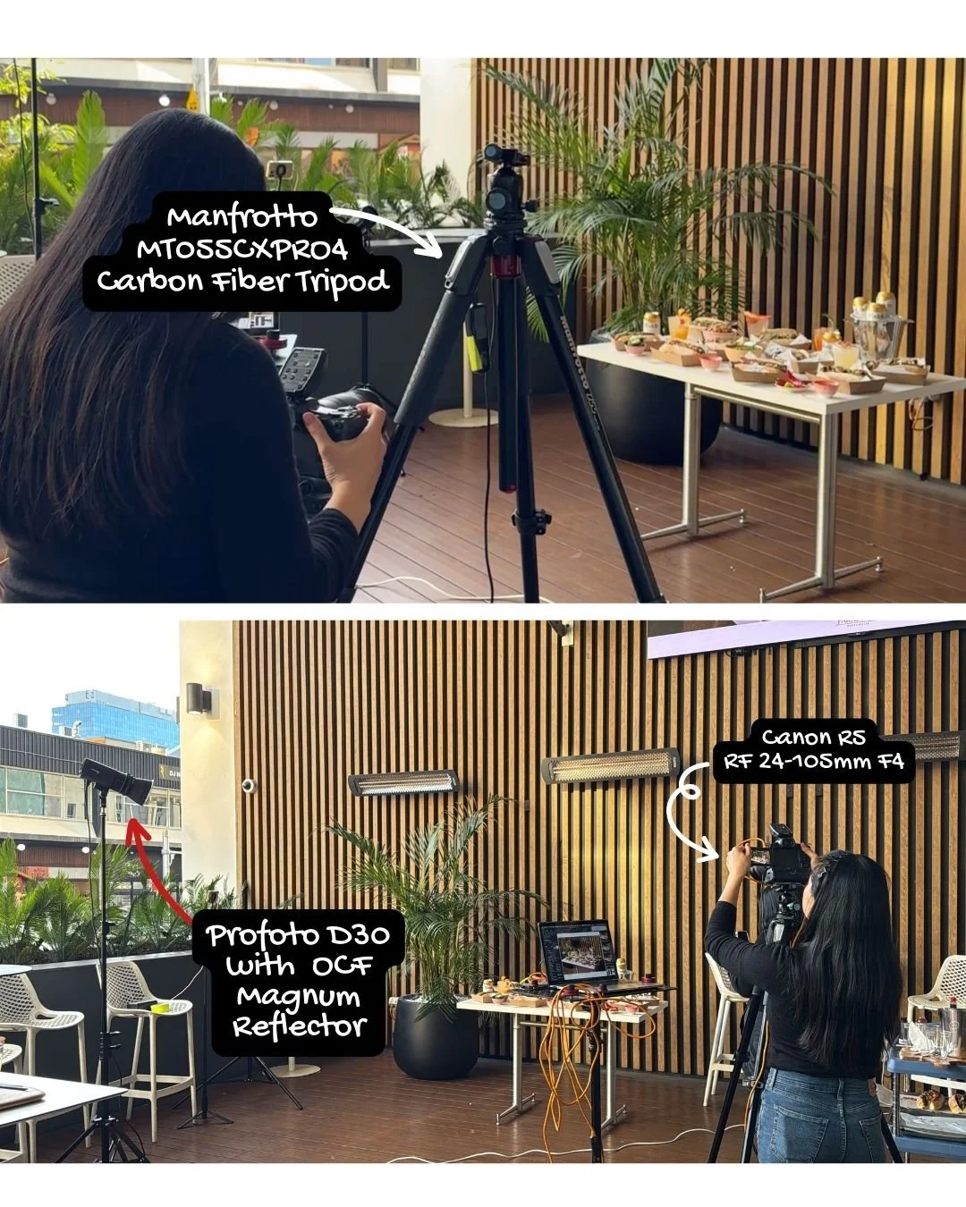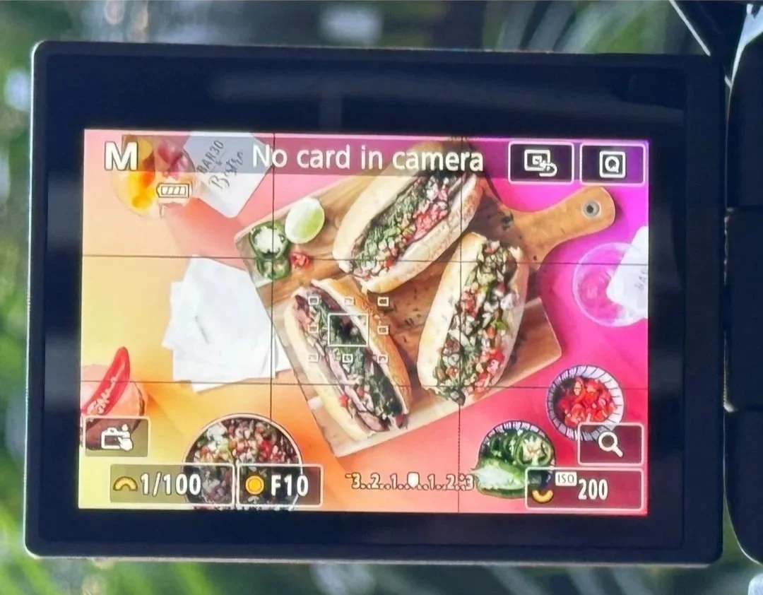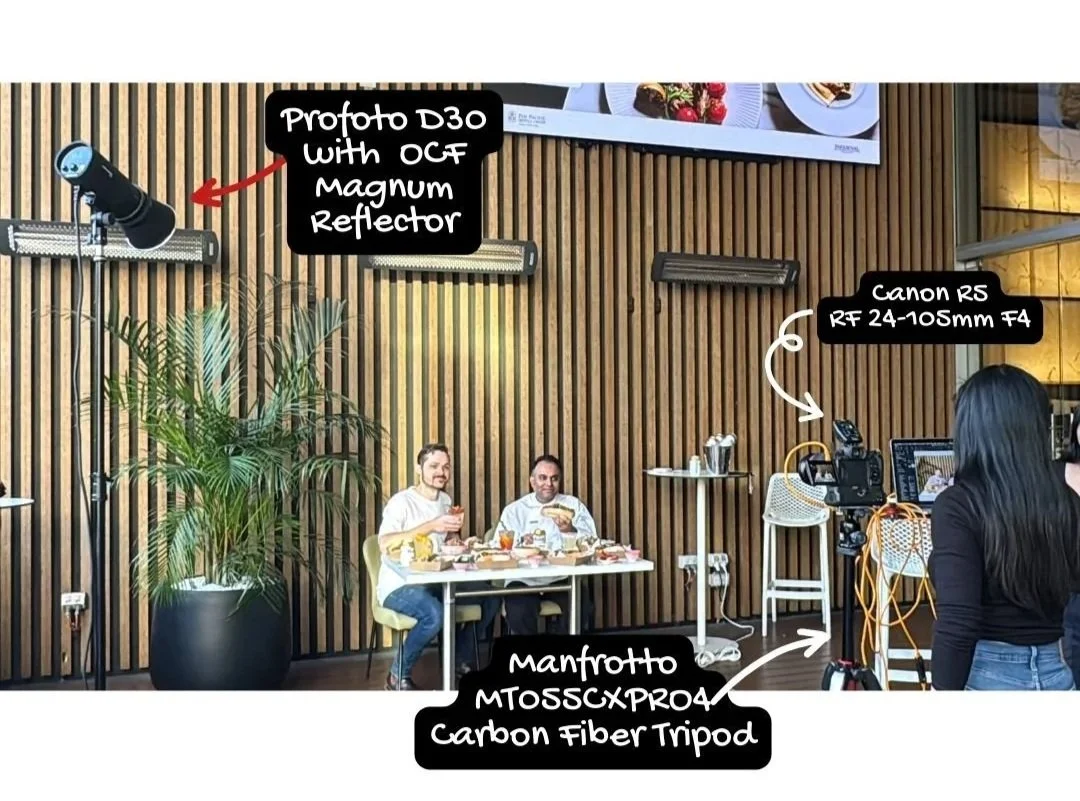 Taking a visually stunning food and lifestyle photograph requires more than just a good eye, it demands professional-grade equipment and meticulous setup. In our 'Behind the Scenes' image, you can see the high-power tools we used to create that vibrant, appetising final shot. Our key light source was the Profoto D30 with an OCF Magnum Reflector, positioned on the left to provide a powerful, directional light that perfectly highlights the subjects and the incredible food spread. This setup ensures that the colours pop and the textures are rendered beautifully. The camera capturing the moment was a Canon R5, paired with the versatile RF 24-105mm F4 lens, giving us the clarity and flexibility needed to capture the scene, from wide shots of the environment to tight close-ups of the dishes.