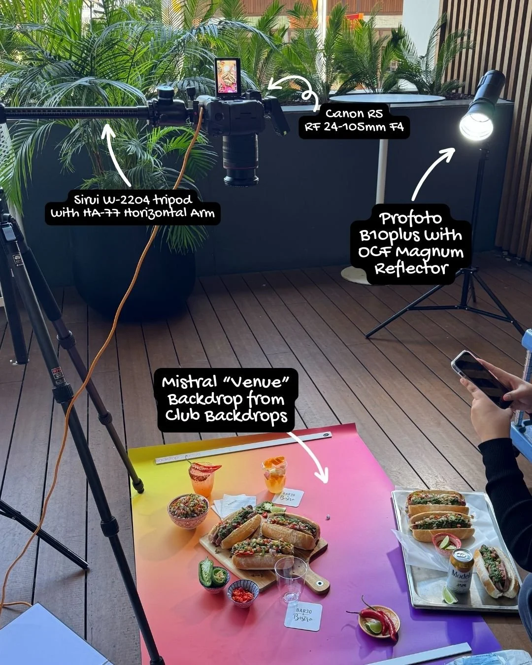 To tackle the challenging angles required for top-down food photography, we relied on a robust tripod setup: the Sirui W-2204 Tripod paired with the HA-77 Horizontal Arm. This configuration allows the heavy Canon R5 with the RF 24-105mm F4 lens to be safely extended directly over the subject, eliminating the photographer's shadow and capturing that popular flat-lay perspective. The choice of the Mistral "Venus" Backdrop from Club Backdrops provided a beautiful, gradient color field that added vibrancy and visual interest beneath the food, making the entire composition pop without distracting from the main subject.