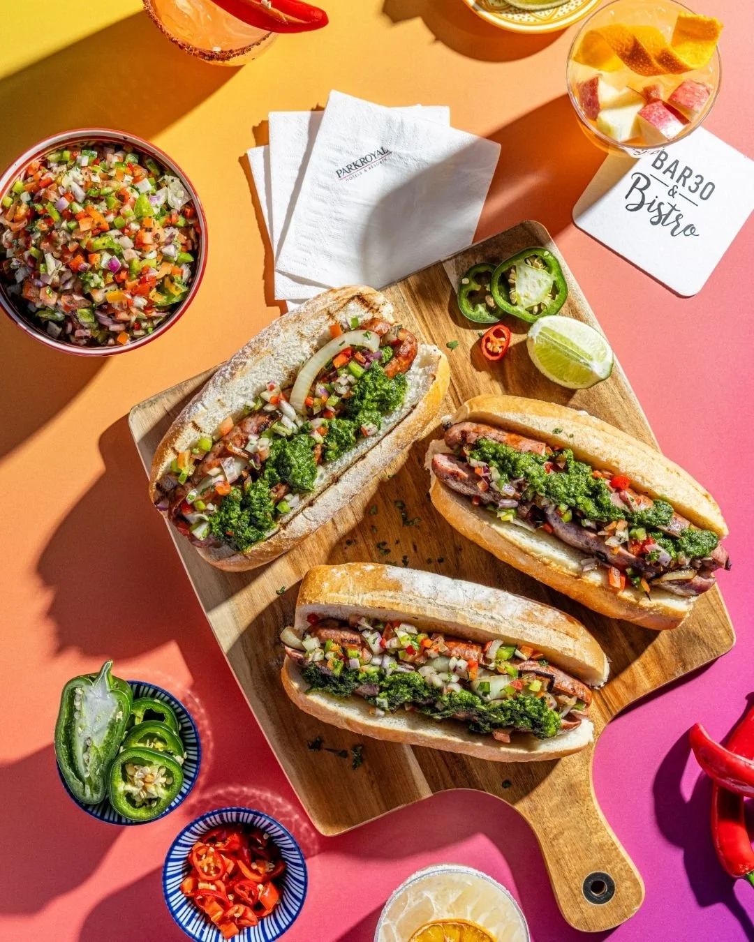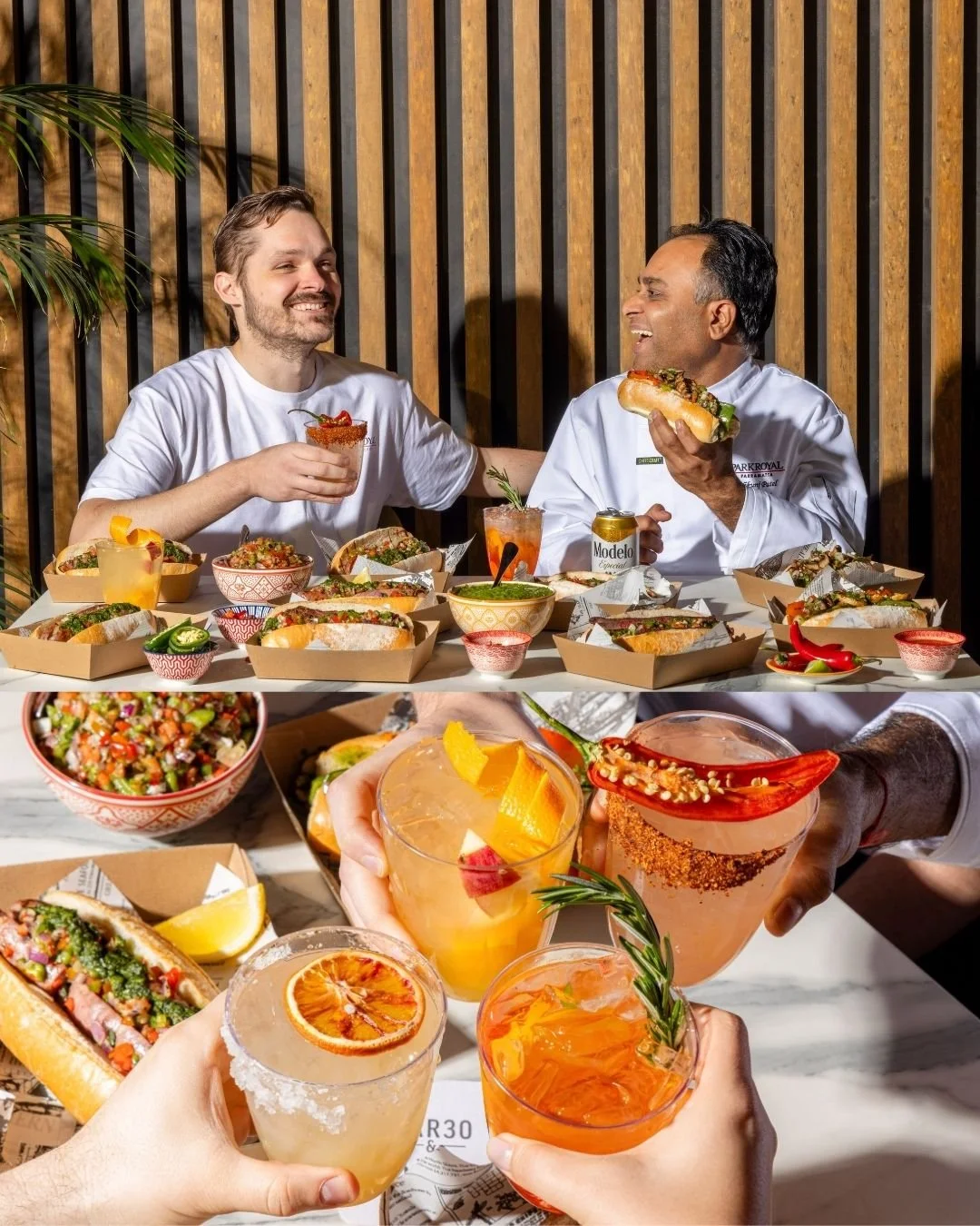 All that effort in the setup culminates in a delicious result! Our final photo captures more than just a meal; it captures a moment of genuine connection and enjoyment. The two subjects are sharing a laugh over a table laden with fresh, colourful Argentinian-inspired fare—sandwiches, hot dogs, and vibrant bowls of salsa criolla. The lighting setup we carefully built ensures that every dish looks as mouthwatering as it tastes, with rich, appetising colours and perfect texture. The close-up montage at the bottom highlights the artistry of the beverages, from a bright margarita garnished with a dehydrated orange slice to a spicy, vibrant cocktail accented with a chilli pepper. This final image beautifully merges professional photography with the simple joy of sharing great food and company.