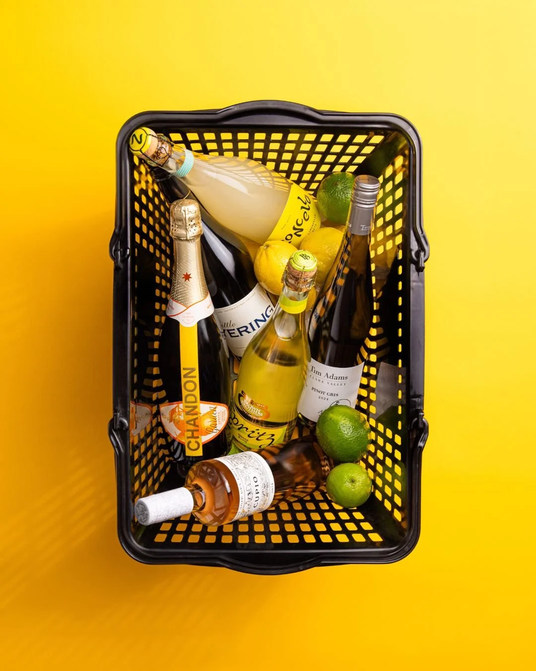 Sometimes the most engaging product photography is achieved not with many different types of gear. The image above shows a great example of a portable and efficient setup designed to create a vibrant, high-impact product shot featuring a collection of bottles within a basket. This setup prioritises simplicity, colour, and strategic light placement.