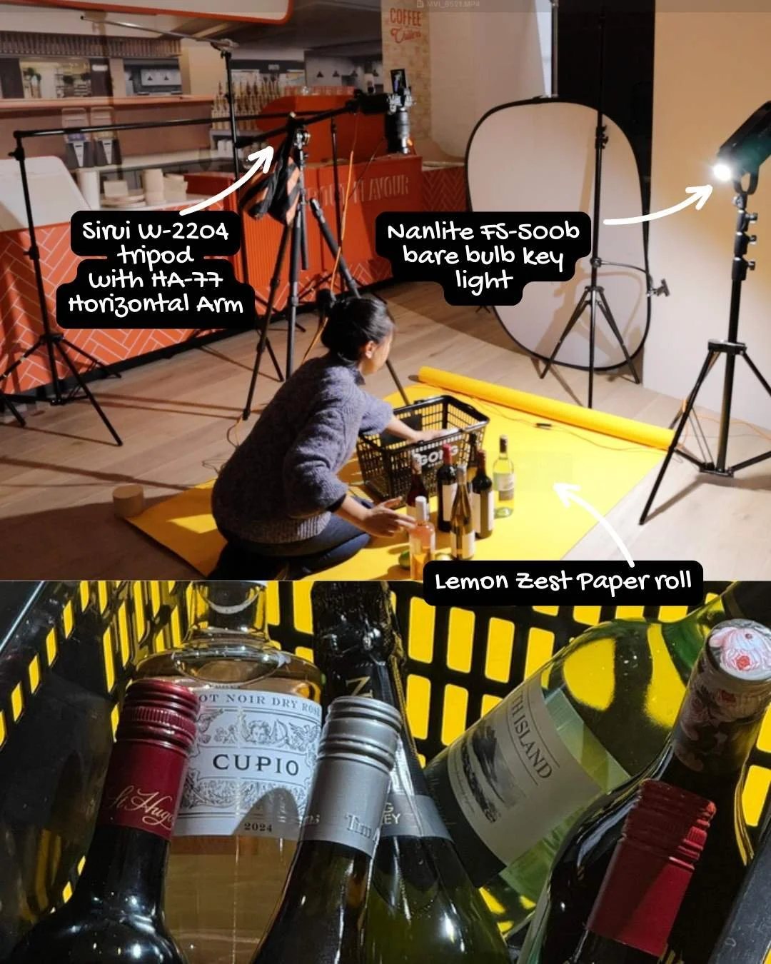 This approach generates intentional, deep shadows and bright, sharp highlights (specular reflections) on the glass and liquid. While often avoided, this dramatic, punchy look is perfect for edgy commercial work, giving the bottles a strong, defined form. The intensity of the FS-500B ensures that even when bouncing off the bright yellow floor, the light source maintains a strong presence and directionality, highlighting the texture of the basket and the rich colors of the bottles within.