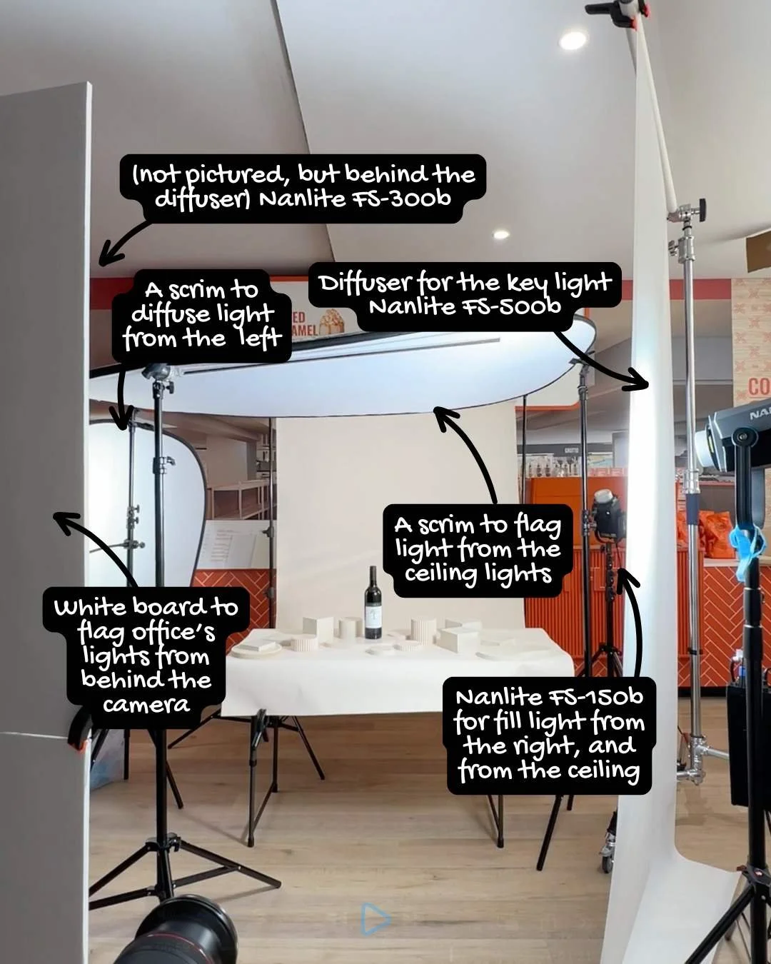 (not pictured, but behind the diffuser) Nanlite FS-300B